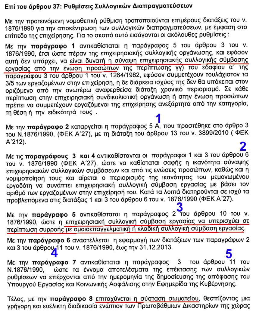 Καταργούνται οι συλλογικές συμβάσεις που έχουν υπογράψει με τα σωματεία, συνδικάτα, ΓΣΕΕ και λοιπά οι ιδιωτικές επιχειρήσεις. Δίνεται το δικαίωμα στον εργοδότη, να συμφωνήσει σε νέα "επιχειρησιακή σύμβαση", με μια ομάδα εργαζομένων, που λέγεται "ένωση προσώπων" (νέος ορισμός, όχι τα σωματεία που υπάρχουν ήδη), εφόσον σε αυτή την ένωση συμμετέχουν τουλάχιστον τα 2/3 των εργαζομένων. Η σύμβαση αυτή υπερισχύει όλων των άλλων (κλαδικών κλπ).Για παράδειγμα: